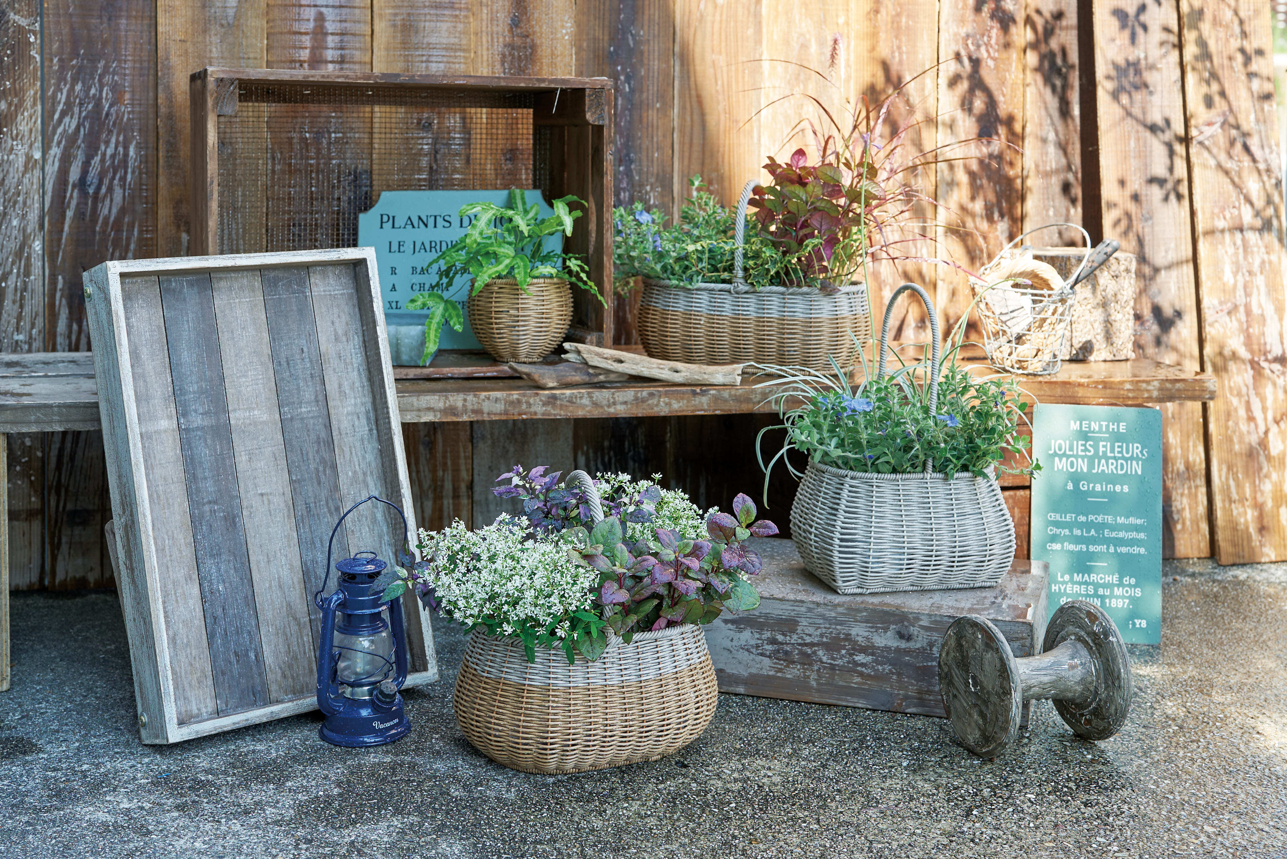 細かな編み目がきれいなガンセトシリーズ。プラスチック素材で内側にビニールカバー付きなので安心して水やりができます。軽量で持ち運びやすく、どんな場所にも自然にマッチするおしゃれなデザインです。