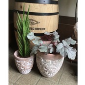 ころんとしたフォルムの蒸れにくいテラコッタ素材の鉢。花や果実、トリの模様が立体的に描かれています。鉢の底に直径約2cm の穴あり。